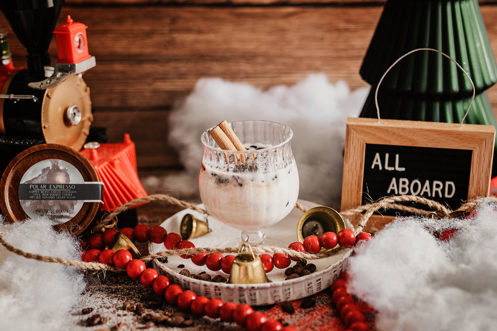 Infusion kit contains: espresso beans, milk chocolate powder, cinnamon stick and a eggnog coffee infused sugar stick.